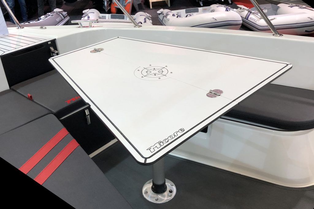 Trevligt och praktiskt bord som kan plockas ned och förvaras i stuvutrymme eller sänkas och med den medföljande dynan skapa en sunbed i fören.